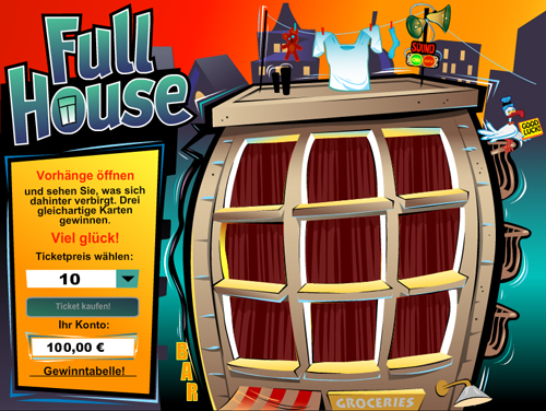 Anschließend darfst du dann wirklich virtuell in das Full House, indem du die Vorhänge aufmachst. Dahinter verbergen sich die merkwürdigsten Dinge. Vorhänge bzw. Fenster, die von diesen verdeckt werden gibt es neun bzw. drei mal drei Stück. Dahinter verbergen sich die lustigsten Gestalten und Dinge. Hast du drei davon in einer Reihe, dann darfst du dich über einen tollen Gewinn freuen.