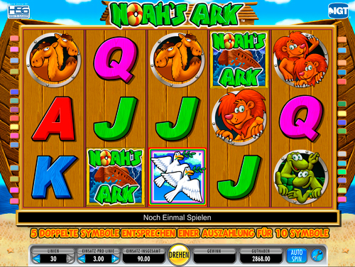 Im Endeffekt kannst du damit auf fünf Walzen Gewinnkombinationen mit zehn Symbolen bekommen. Diese Tiere sind dann Löwen, Nilpferde, Elefanten, Kamele und Schildkröten. In den Freispielen wechseln diese Symbole dann und auf einmal sorgen Giraffen, Geißböcke, Zebras, Vögel und Krokodile auf dich. Ach ja und wenn wir dann schon dabei sind die Freispiele werden durch die weiße Taube ausgelöst. Und ein Wild Symbol gibt es natürlich auch, dass ist die Arche direkt.