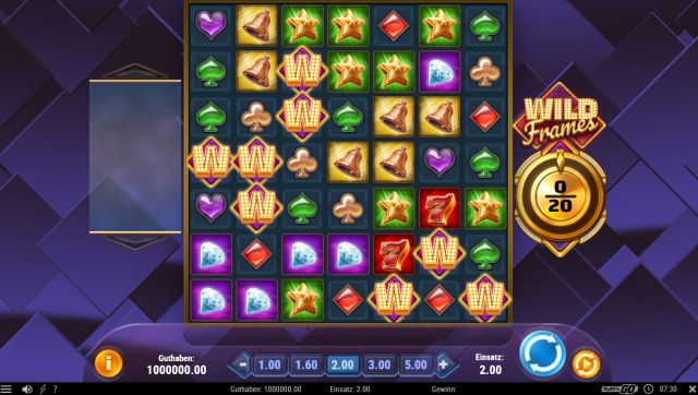 Schon jetzt dürfte sich herumgesprochen haben, dass die Macher beim Wild Frames Automat keine Gewinnlinien und Walzen im klassischen Sinne verwenden. Stattdessen erwartet dich ein Raster aus 7×7 Feldern, auf welchem verschiedene Symbole auftreten. Die meisten von ihnen stehen für traditionelles Glücksspiel und werden dir deshalb auch höchstwahrscheinlich schon einmal begegnet sein. Wann immer sich nun fünf und mehr identische Symbole verbinden, erhältst du einen Gewinn. Die Höhe variiert nach Symbolart, Länge des Clusters und nicht zuletzt nach dem Einsatzwert. Den wiederum kannst du in jeder Runde neu festlegen.